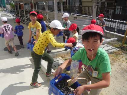 2年生は、自分の鉢にチューリップの後、プチトマトを植えます。