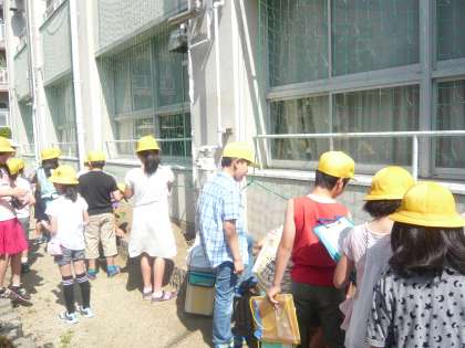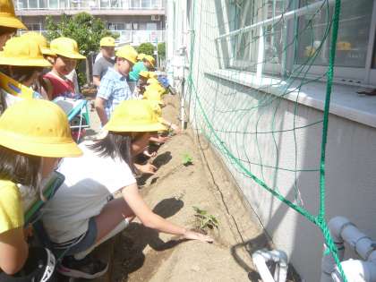 多目的室裏で4年生がヘチマの植え付けをしていました。