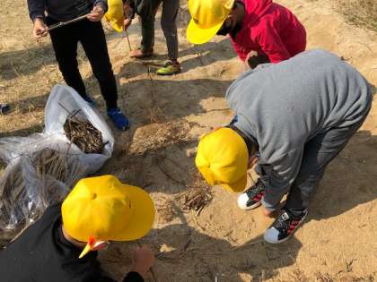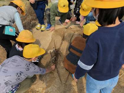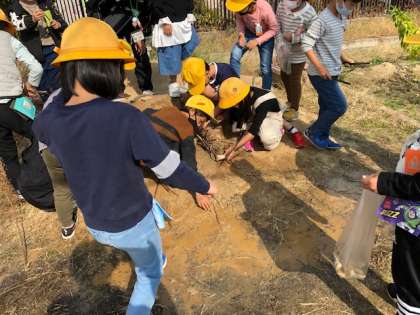 今日は子ども達がビーバーの真似をして、流れる水を木の枝や石などを使ってせき止めてみました。みんなで力を合わせてもなかなかせき止めることはできません。ビーバーの知恵を実感した活動でした。