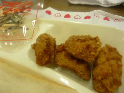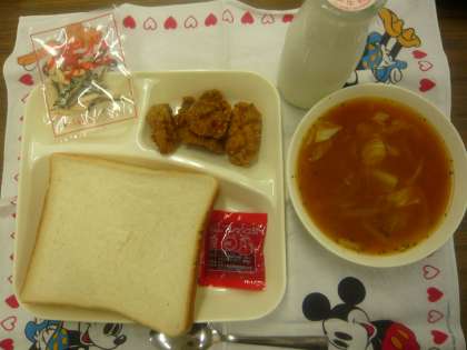 献立は、一口トンカツ、フレッシュトマトのスープ、食パン、いちごジャム、アーモンドフィッシュでした。