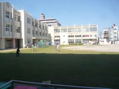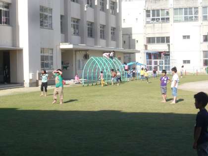登校後すぐに芝生に出て遊ぶ子どもたち。