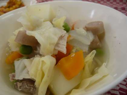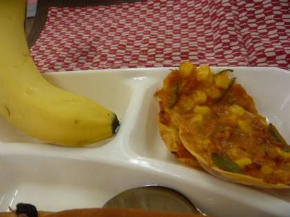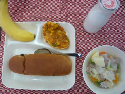 献立は、豚肉とキャベツのスープ煮、変わりピザ、レーズンパン、牛乳、バナナでした。