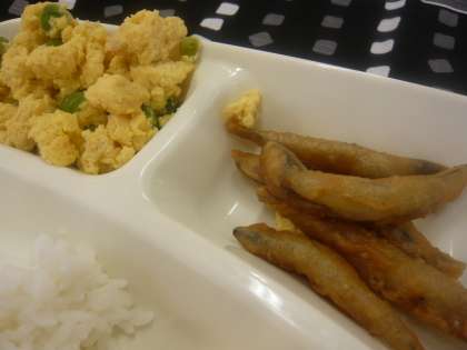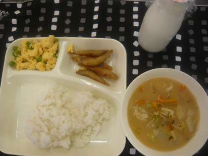 献立は、きびなごの天ぷら、みそ汁、えんどうの卵とじ、ごはん、牛乳でした。