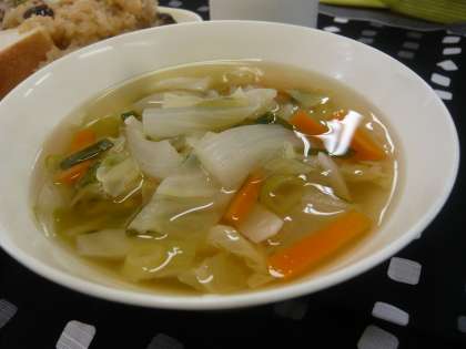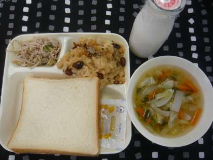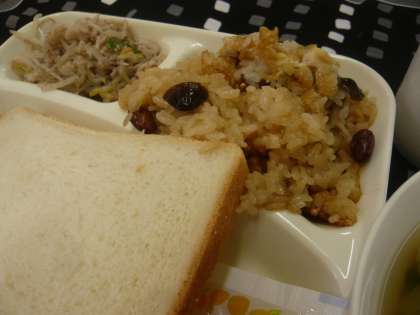 献立は、豚肉と野菜のいためもの、すまし汁、金時豆のおこわ、食パン、ジャム、牛乳でした。