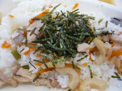 かやくご飯は、配膳されてから各自でかやく(具材)とご飯を混ぜ合わせます。最後にもみのりを振りかけていただきます。具材にしっかりと味がついているので、とてもおいしくいただきました。