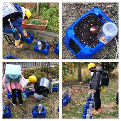1年生、2年生が大切にお世話をしているチューリップと水せんの球根から少しずつ芽が出てきました。