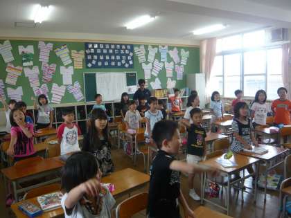 土曜日のスポーツ集会に向けて「ゴーゴーゴー」を歌っていました。