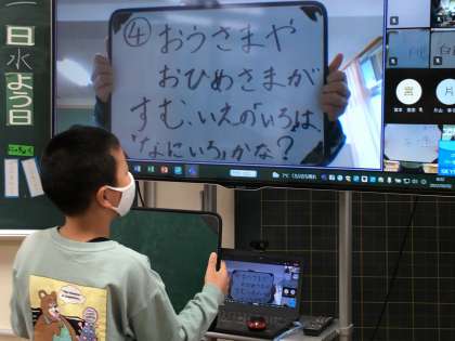 「おうさまやおひめさまがすむいえのいろは何色かな?」→「(答え)白(おしろ)」など、なかなか難しい問題もあり、各クラスで大いに盛り上がりました。
