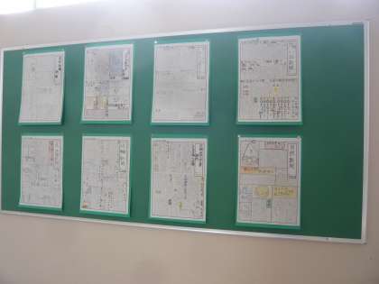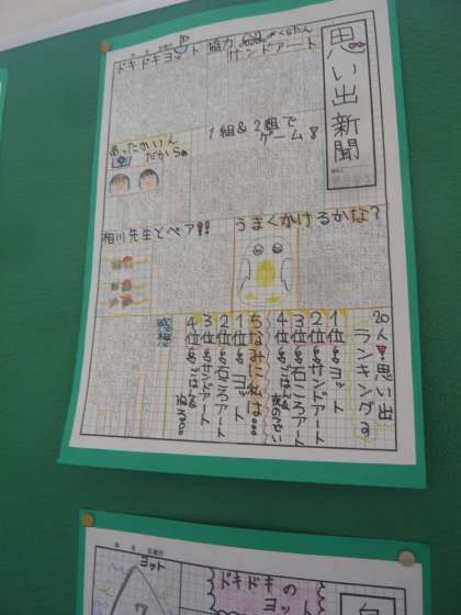 階段踊り場の掲示板に、6年生の自然体験教室「思い出新聞」が掲示されていました。