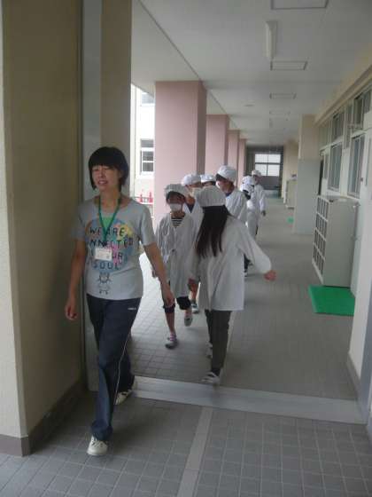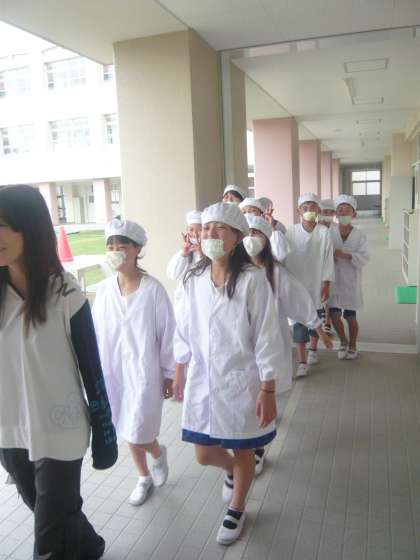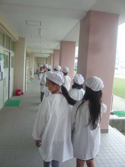給食を取りに行く子どもたち。