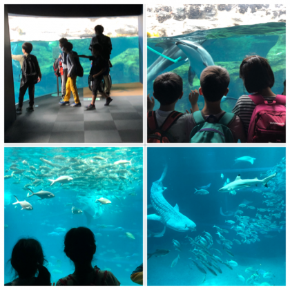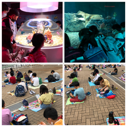 到着。海の底を歩いているかのようなトンネル型水槽「アクアゲート」をくぐり、見学のスタートです。館内ではゆっくりと様々な海の生き物を見て回りました。常設展示水槽の他、特別展示や期間展示の生き物もいて、子ども達は水槽に到着するたびに大きな歓声を上げていました。手が届くかと思われる距離を海の生き物が泳ぎ回る様子に子ども達は大満足でしたお昼は、海を眺めながら気持ちよくお弁当。午後からは、標高4.53mの「天保山」登山も体験しました。