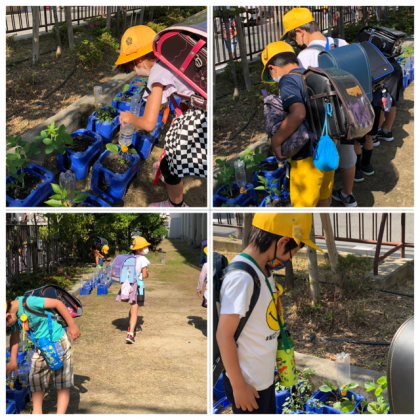今、1年生がアサガオ、2年生が夏野菜、3年生がホウセンカを鉢で育てています。