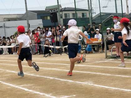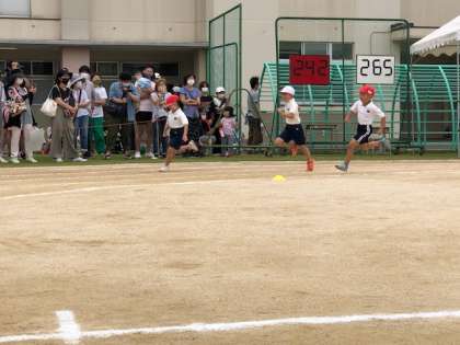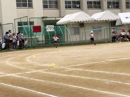 2年生の個人走「ダッシュでGO」です。初めてトラックを使って個人走に挑戦しました。カーブを上手に走り抜けました。