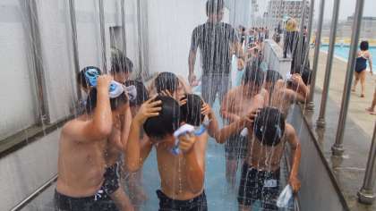 準備運動に続いてシャワーを浴び、最後は、水慣れの自由時間がありました。