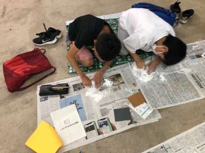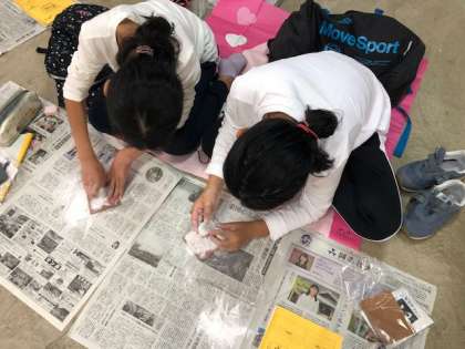 子ども達、黙々と削ります。白い粉で一杯になってきました。