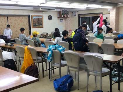 一生懸命勾玉づくりに取り組んで、宿舎に戻ってきました。これから、ふりかえりの会です。