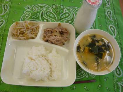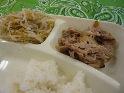 献立は、豚肉の甘辛焼き、みそ汁、もやしのごま酢あえ、ごはん、牛乳でした。