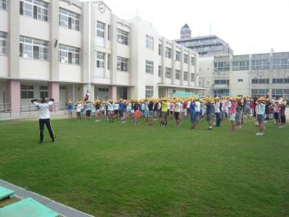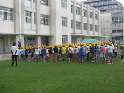 青々としてきた芝生の上で、児童朝会を行いました。