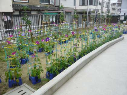 1年生が育てている朝顔の花が次々に咲いています。