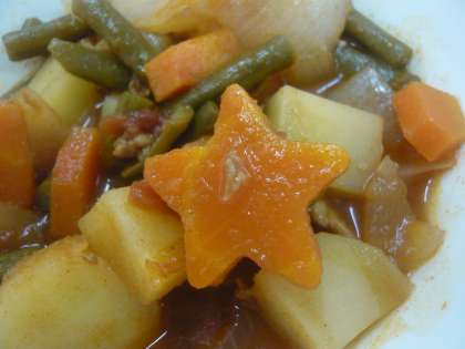 ケチャップ煮をよく見ると、星型のラッキーにんじんが入っていました。
