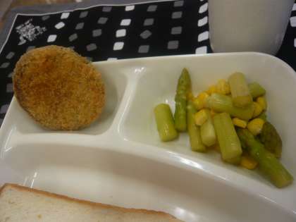 献立は、チキンレバーカツ、ケチャップ煮、グリーンアスパラガスのサラダ、パン、牛乳、ジャムでした。