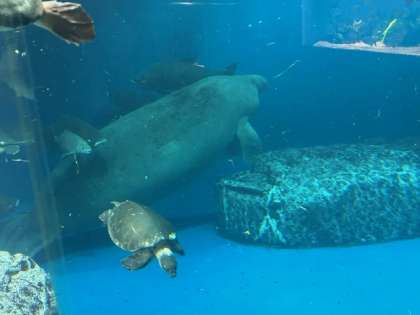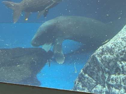 ジュゴンと同じ海牛類のマナティーです。マナティーはジュゴンと違い、川で暮らしているので、前ビレを足のように使って歩きます、