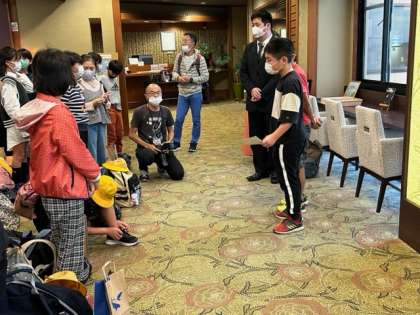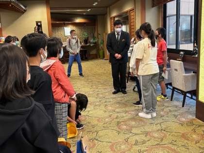 入所式です。お世話になるホテルの方にしっかり挨拶をします。