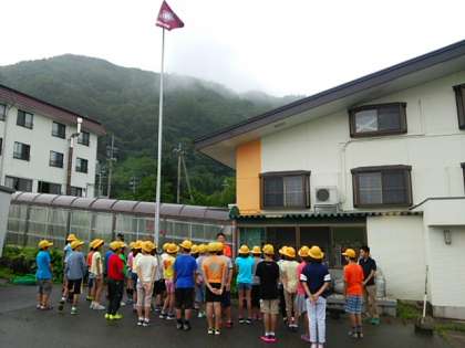 宿舎前で開舎式です。全員元気です。バス酔いもなく、今は、雨もあがっています。