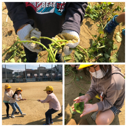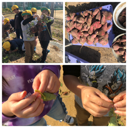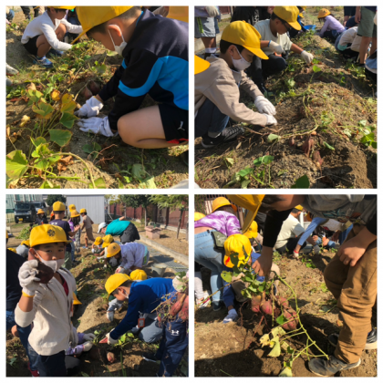 今日は2年生が春から大切に育てたサツマイモを収穫しました。大きなサツマイモを見つけると、「すごい!」「傷つけないようにやさしく!」と一生懸命に掘っていました。