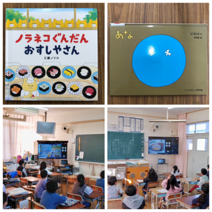 図書・放送委員による絵本の読み聞かせがあり、低学年は「ノラネコぐんだんおすしやさん」高学年は「あな」でした。