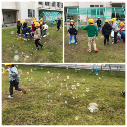 1・2年生が芝生でシャボン玉遊びをしました。いろいろな形の道具を使い、大きなシャボン玉や、沢山の小さなシャボン玉を作るにはどうしたらいいかを考えながら楽しみました。