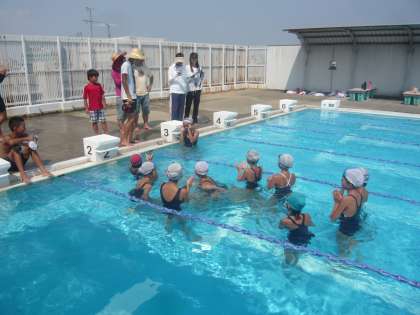 泳いでいない子どもが、泳いでいる子どもを応援していました。
