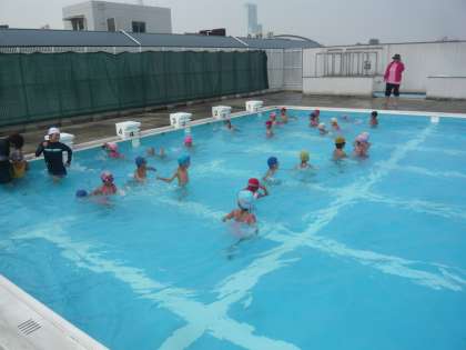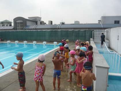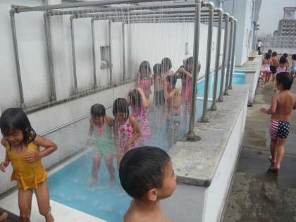 水位を下げたプールですが、幼児の園の子どもたちは怖がることなく水遊びを楽しんでいました。