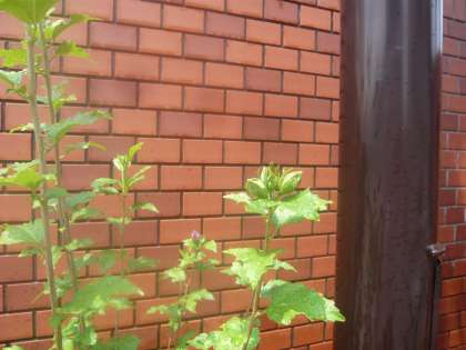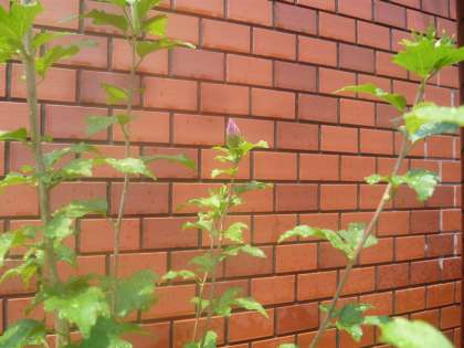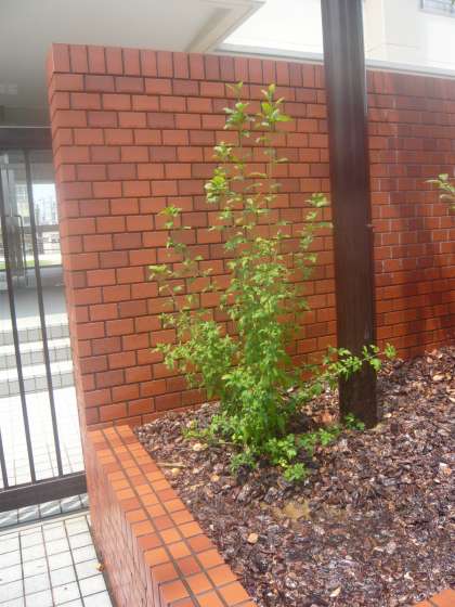 正門玄関脇の植え込みにあるムクゲは、まだ小さいですがこの猛暑にも負けず青々と成長しています。