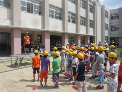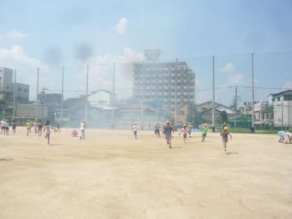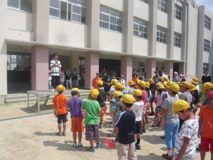 花火が打ち上げられました。パラシュートが落ちてきたので、子どもたちは取りに走り出しました。