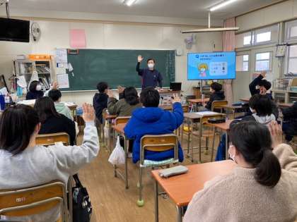 6年生が学校薬剤師久世先生より、薬の正しい使い方や間違って服用するとどうなるのかということを学習しました。途中、ビタミンとうがい薬を混ぜるとどうなるかという実験もあり、薬を水やぬるま湯で飲む理由が目に見えてわかったようです。