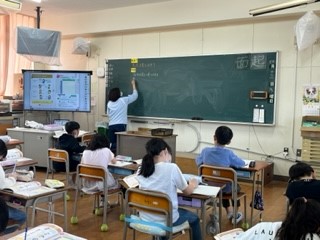 今、3年生の算数は、2年生で習ったかけ算九九を振り返り、かけ算のきまりを考えています。「図を描いて・・・」「かたまりのいくつ分が・・・」「かけられる数とかける数を入れかえても・・・・」と、自分の意見を発表していました。