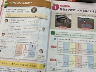 5年生は算数科で、「3.75ってどんな数?」を学習しています。位を確認して、整数と小数のしくみを考えていきました。