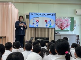 新学期がスタートして、各学年、発育測定を実施しています。今日は、1年生が初めての発育測定でした。測定前、保健室の先生から「発育測定のきまり」の話がありました。みんな、集中して話が聞けていました。先生からお褒めの言葉をいただいていました。