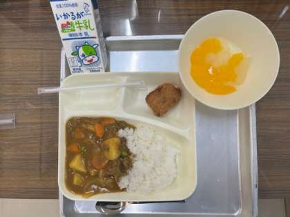 今日の給食メニューは、子どもたちの大好きな「カレー」です。1年生の入学をお祝いする「お祝い献立」です。デザートもついて、とってもおいしくいただきました。給食調理員さん、今日もおいしい給食をありがとうございました。
