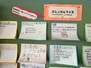図書室掲示板に、図書委員会のメンバーが作成した「としょかんクイズ」を掲示しています。図書室のことや、図書室に置いてあるたくさんの本のことなど、とても興味深い内容になっています。「さあ、みんなでクイズにチャレンジしてみよう!!!」