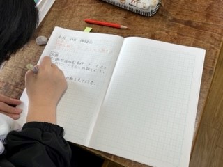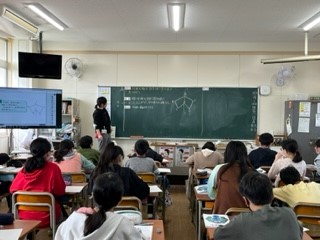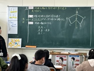 「点Bと対応するのは?」と担任の先生からの質問に、児童たちは、ポイントとなる「対称の軸」を探し、自信をもって「点Fです」と答えていました。