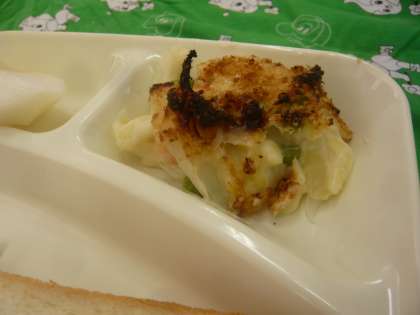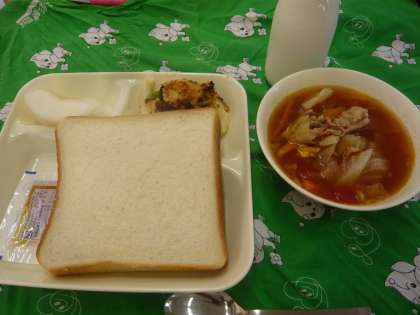 献立は、えびグラタン、トマトスープ、なし(豊水)、食パン、ジャム、牛乳でした。