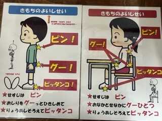 本校では、立った時、座った時に、「きもちのよいしせい」を意識できるように声がけをしています。姿勢が整えば、心も整います。落ち着いた気持ちで学習に向かってほしいと願っています。