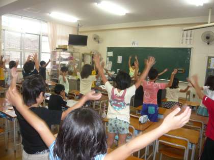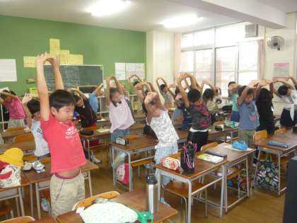 今週は、月初めの健康週間ですので、読書タイム後に健康チェックとノビノビたいそうをしました。