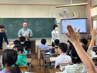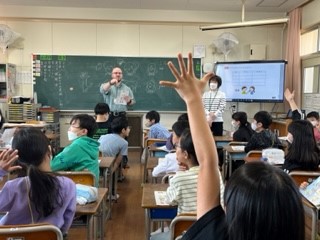 今日の4年の外国語、あいさつをして、友だちのすきなことなどをたずねてたりして答えたりしていました。