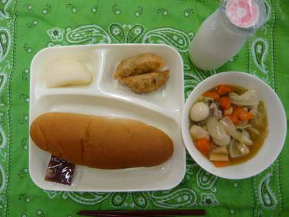 献立は、鶏肉と野菜のうま煮、あげギョーザ、なし(20世紀)、パン、ジャム、牛乳でした。