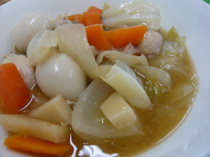 鶏肉と野菜のうま煮は、中華風で最後に水でといたでんぷんでとろみをつけ、冷めにくくしっかりした味でいろいろな野菜をおいしくいただきました。