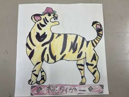 先日お知らせしていました、本年度のキャラクターを決める投票が締め切られ、8日の児童朝会で、児童会代表児童からキャラクター決定の報告がありました。キャラクター名は、「桃タイガー」です。