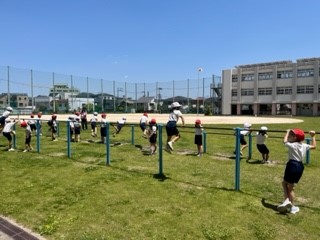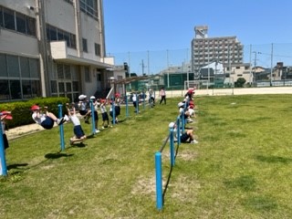 今日の体育は「てつぼう」です。両手でしっかり体を支えます。その状態で、横に移動。なかなか難しそうでしたよ。